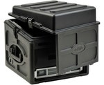 10U päällä mikserille / soittimille ja 6U edessä päätteelle ja efekteille. SKB R106:ssa on kova kansi ja sivut sekä takaa aukeava paneeli johtojen kuljetusta varten. Läppärihylly AV-8 (lisävaruste) mahtuu myös kannen alle kuljetuksen ajaksi.