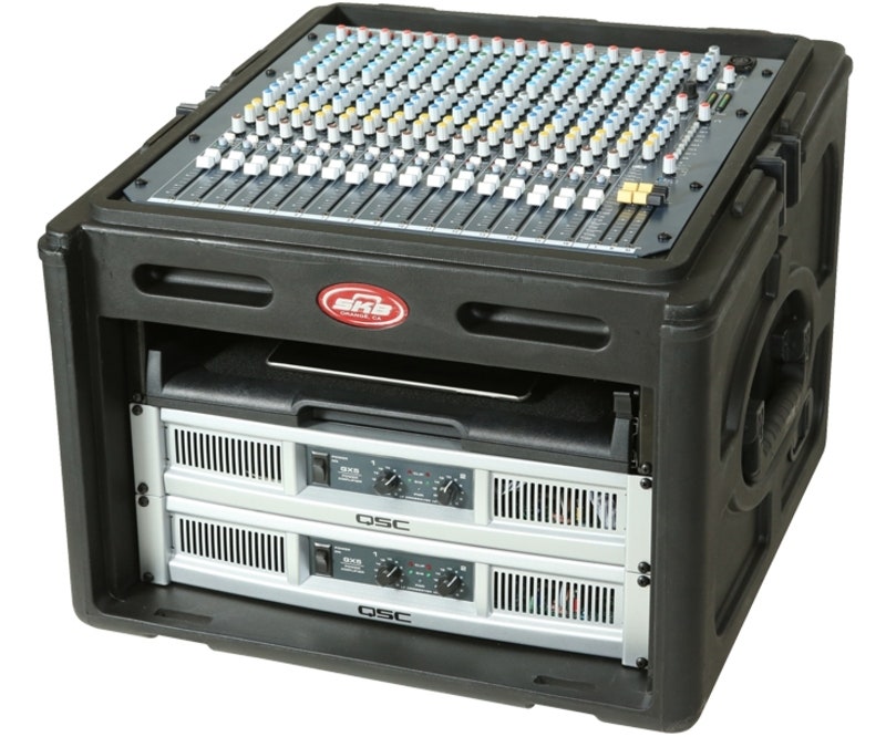 Tuotenumero 1801156SKB-R106, mikseri ja efekti / vahvistin räkki. 10U tilaa päällä mikserille / soittimille ja 6U tilaa edessä päätteelle / efekteille.