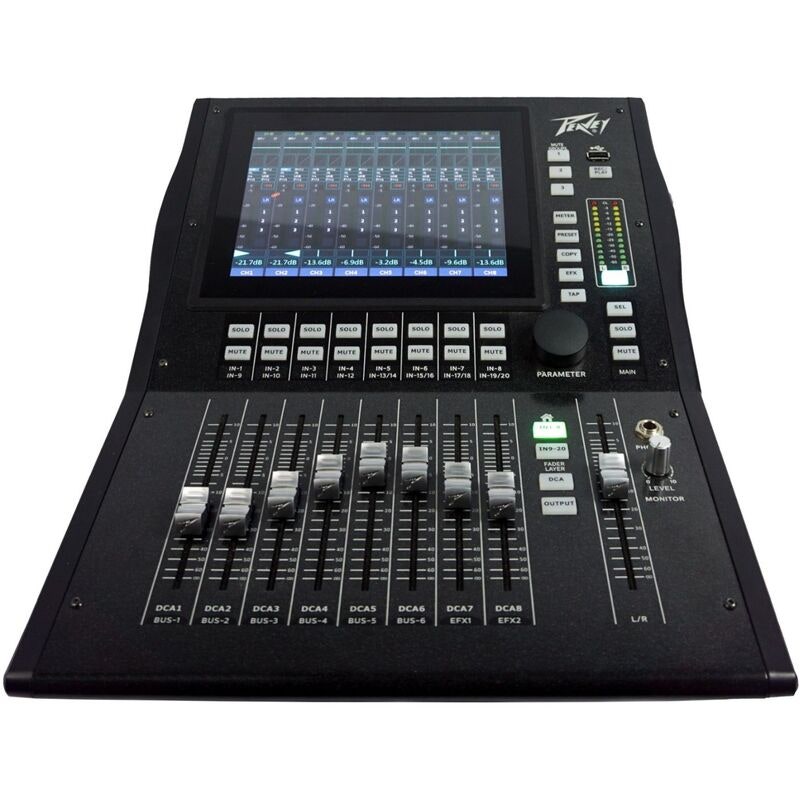 The Peavey Aureus Mini digital mixing console is aimed at musicians, technicians and small organisations looking for a modern, clear and efficient tool. It has 20 inputs and 12 outputs, enough to manage a full band, vocals, instruments and separate returns. The 9 motorised 100mm faders make it easy to make live adjustments and give an immediate overview of active levels. The 8" touch screen is easy to read and navigates smoothly, even under live conditions. 48 V phantom powering on 12 channels means that condenser microphones can be used without constraint.