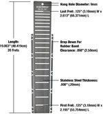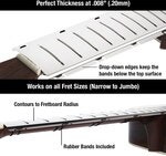 Ei ole mitään parempaa kuin mielenrauha samalla kun säästät aikaa ja rahaa. MusicNomadin patenttihakemuksessa oleva Fret Shield asettaa uuden, korkeamman standardin täydelliselle otelaudan suojaukselle nauhatyöskentelyn aikana, kuten kiillottamisessa, tasoittamisessa ja kruunauksessa. Sano "EI" siniselle teipille uudelleenkäytettävällä suunnittelullamme, joka menee paikoilleen sekunneissa, suojaa täydellisesti vahingoittamatta otelautaa ja kestää satoja nauhatöitä. Korkealaatuinen ruostumaton teräs on täydellisellä paksuudella (.008" / .20mm), valmistettu tarkkuusprosessilla ja kaikki reunat ovat sileitä ja pyöreitä. Innovatiivisesti muotoillut reunat mahdollistavat sisällytettyjen kumilenkkien pitävän Fret Shieldin paikoillaan turvallisesti ja pitävät nauhat pinnan alla estäen niiden vahingoittumisen kiillotusprosessin aikana. Fret Shieldsit tulevat suosituimmissa skaalakoissa ja sisältävät kätevän ripustusholkin. Olipa otelautasi viimeistelty vaahtera tai viimeistelemätön ruusupuu otelautamerkeillä, otelautasi kiittää sinua sen suojaamisesta. Se on MusicNomad-laatua – nostaa rimaa välineiden huollossa.