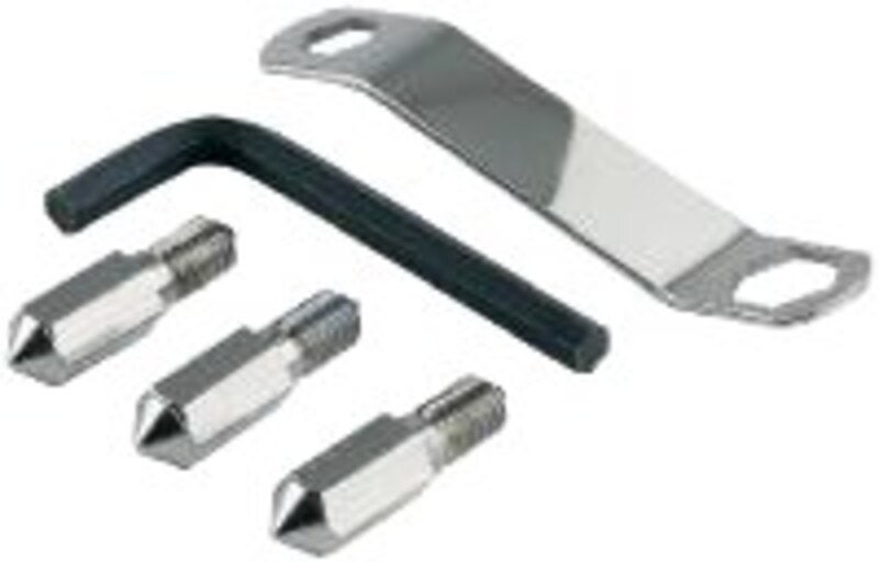 Kiinnitä piikit K&M 14000 »Gomezz« - rumputuolisi kumitassuihin. Voit vaihtaa olemassa olevat kuusiokoloruuvit kätevästi piikkeihin, jotta rumputuolisi pysyy tukevammin paikoillaan. Setti sisältää kolme piikkiä, kuusiokoloavaimen (kuusiokoloruuvien irrottamiseen) ja lenkkiavaimen (piikkien kiinnittämiseen).
