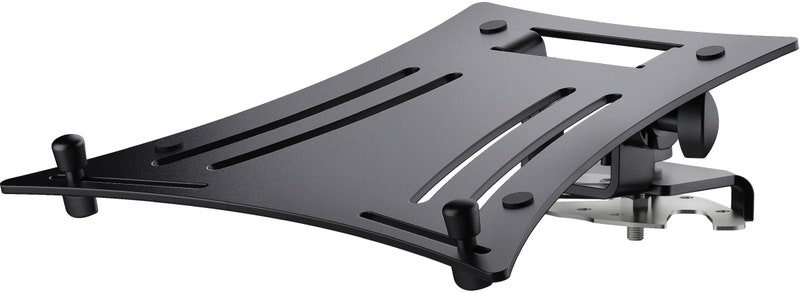 Appealing laptop attachment for »Spider Pro« and »Baby Spider Pro«. The laptop rest is mounted on the upper end of the keyboard stand »Spider Pro« or »Baby Spider Pro« by means of a wing nut and retaining plate. The aluminium shelf can be adjusted horizontally or inclined in three positions. Individually adjustable stop pins with rubber caps enable the use of all common laptop models, mixers, etc.