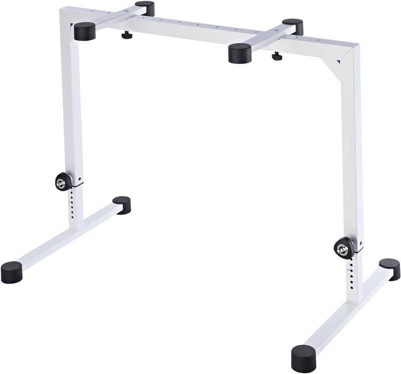 Kompakti teräsputkirakenne ja suuret pyöreät lattiansuojukset tekevät tästä kosketinsoitintelineestä äärimmäisen vakaan. Kahden puolen jousikuormitteiset lukkosäätimet takaavat helpon ja nopean korkeudensäädön.