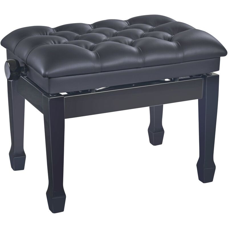 Kenties markkinoiden miellyttävin pianopenkki, joka on varustettu tehokkailla pneumaattisilla kaasujousilla ja normaalia suuremmalla istuinosalla. Portaattomasti säädettävän korkeuden ansiosta penkki on ihanteellinen myös oppilaitoskäyttöön. Korkeakiiltoinen musta viimeistely ja niiteillä koristeltu musta keinonahkaverhoilu antavat tuolille elegantin ulkonäön. Säätöjalkojen ansiosta tuoli pysyy tukevasti paikallaan myös hieman epätasaisemmilla alustoilla.