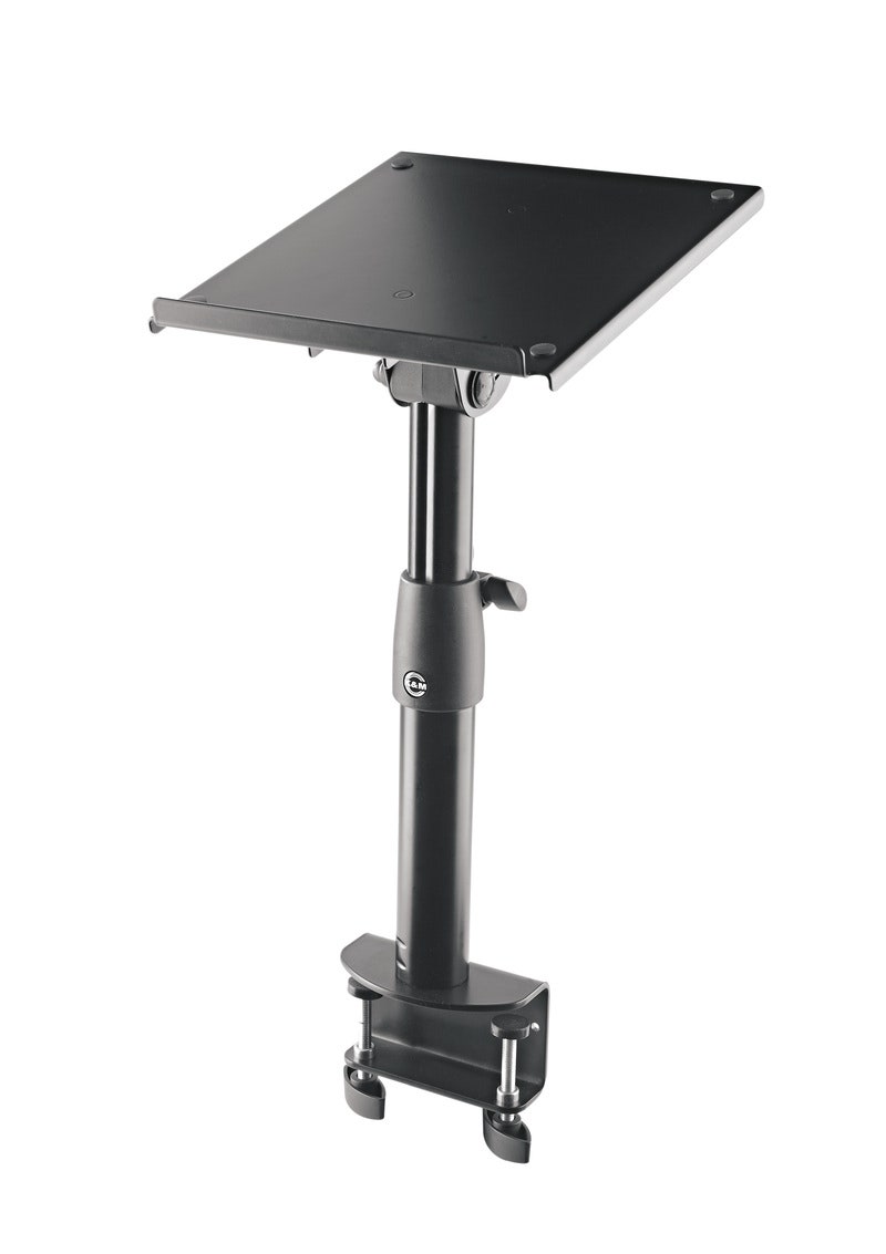 Tyylikäs ja käytännöllisellä puristinkiinnikkeellä varustettu pidike studiokaiuttimille. Pidikettä voidaan kallistaa portaattomasti jopa 12,5° jolloin kaiutintason stoppari varmistaa, että kaiutin pysyy tukevasti telineessä. Käytännöllinen puristinkiinnike mahdollistaa pidikkeen kiinnittämisen 10mm-52mm paksuisiin pöytälevyihin tai muihin vastaaviin tasaisiin pintoihin. Pidikkeen korkeutta voidaan säätää neljässä askeleessa 335mm-435 mm välillä. Kantavuuden osalta telineen keskitetty kuorma voi olla jopa 25 kg.