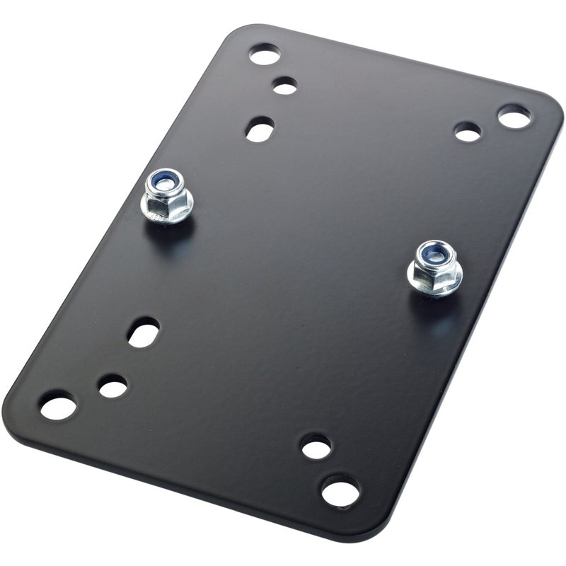Musta metallinen kiinnityslevy, jonka kiinnitysvaihtoehdot listattuna alla olevaan taulukkoon