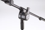 Korkealuokkainen mikrofoniteline teleskooppipuomilla. Telineen taittuvat jalat on kiinni valetussa jalustassa. Patentoitu puristinvarsi voidaan kiinnittää mihin tahansa asentoon ja saat lisäksi kiinnitettyä kiinnitysmekanismiin esimerkiksi mikrofonikaapelin.