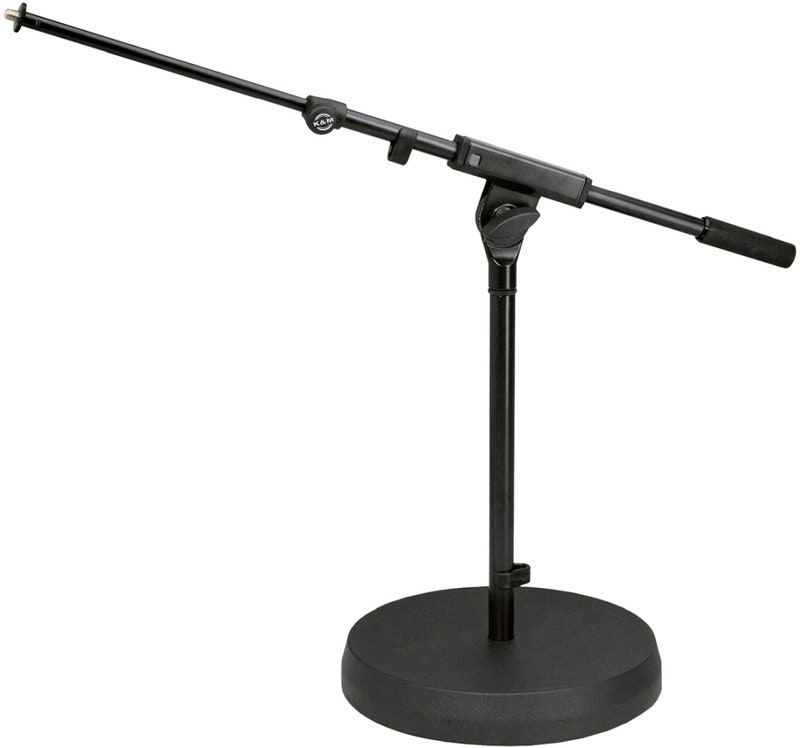 Tuotenumero 25525960Matala puomillinen mikrofoniteline, jossa tuhti valurautainen jalustakiekko tärinänvaimennuksella