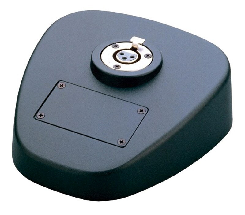 Pöytäjalusta, jossa on integroidut XLR-liittimet joutsenkaulamikrofonin kytkemiseen. Telineen sisällä on tila, jonne voidaan asentaa kytkimiä, merkkivaloja tai muuta elektroniikkaa.