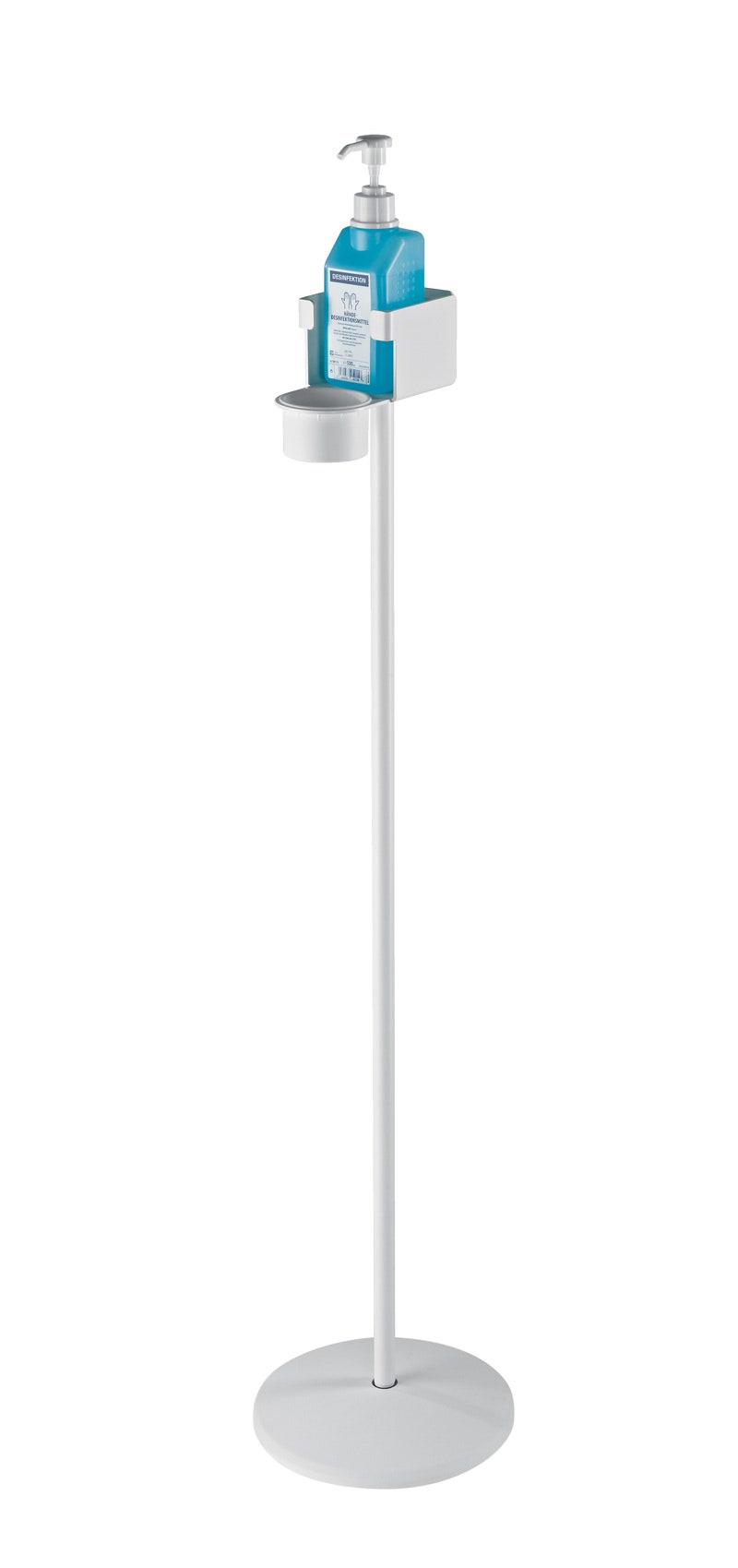 Desinfiointiaineelle ja muille pullotetuille tuotteille suunniteltu teline, jossa on tukeva kiinnike ja keräilyastia. Telineen jalustaputki on päällystetty tyylikkäällä valkoisella puuterimaalilla. Pullotelineen mitat ovat 102mm x 91mm. Desinfiointiaineen pullonkannatin voidaan irrottaa puhdistusta varten. Huomiotavaa on että tämä EI OLE lääketieteellisesti sertifioitu tuote. Desinfiointiaine ei kuulu toimitukseen.