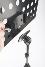 Jauhemaalattu teräksinen nuottiteline, jossa on reiällinen nuottitaso ja jonka kiristimet ovat kestävää muovia. Nuottitelineen taso voidaan kiinnittää ja irrottaa helposti muovisella, käyttäjäystävällisellä pikakiinnityslukolla. Ergonominen siipimutteri tekee kallistuksen säätämisestä helppoa. Telineen korkeus on vapaasti säädettävissä naarmuttamattoman jännitysholkin avulla.