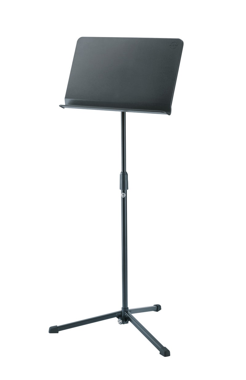 Orkesterinuottiteline, jonka korkeudensäätömekanismi mahdollistaa telineen korkeudensäädön yksinkertaisesti jalustaputkea työntämällä ja vetämällä. Voit varmistaa korkeudensäädön pitävyyden puristusholkilla, kun käytössäsi on yli 2,5Kg nuottikirja. Kevyen muovisen nuottitason kallistus on portaattomasti säädettävissä ja suuret iskua vaimentavat kumipäät varmistavat telineen vakauden. Taitettavan jalustan ansiosta nuottiteline sopii myös keikkailevalle muusikolle.
