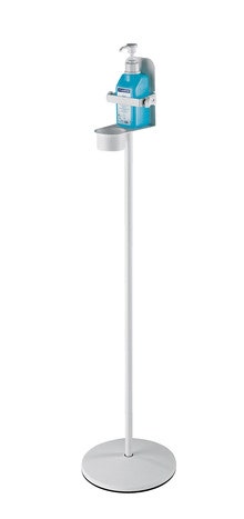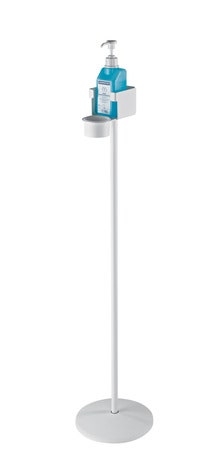 Desinfiointiaineelle ja muille pullotetuille tuotteille suunniteltu teline, jossa on tukeva kiinnike ja...